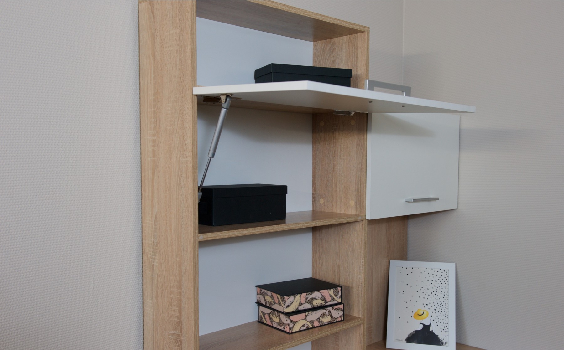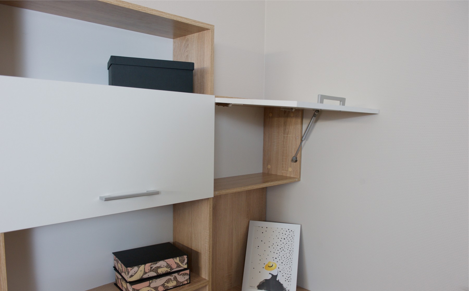 Корпус выполнен в теплом древесном цвете светлого дуба с приятной на ощупь фактурой, фасады - белые матовые. Нейтральные оттенки мебели позволяют легко вписаться уже в готовый интерьер.