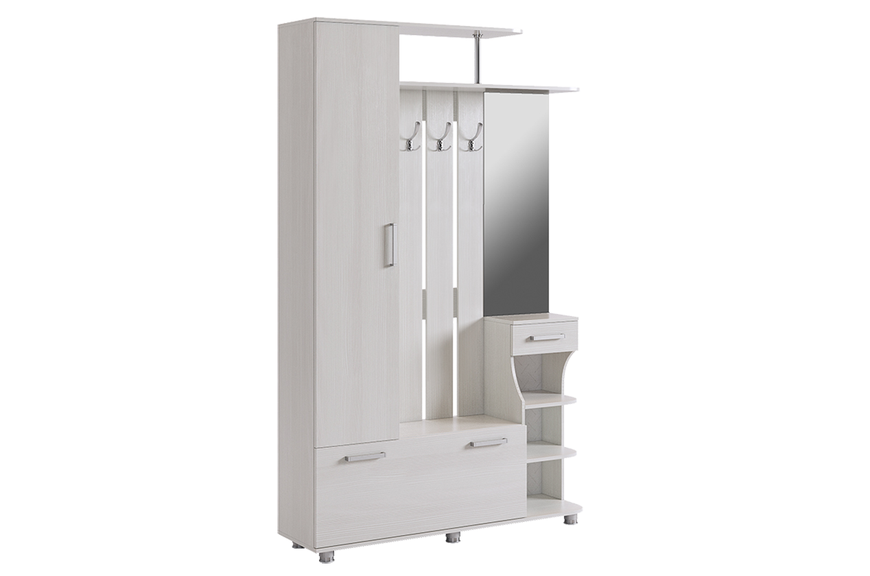Состоит из: шкафа с полками, вешалки с крючками для одежды и сумок, обувницы, открытых полок, зеркала, полки для головных уборов, выдвижного ящика. Сборка универсальная, рисунок на фасадах универсальный.