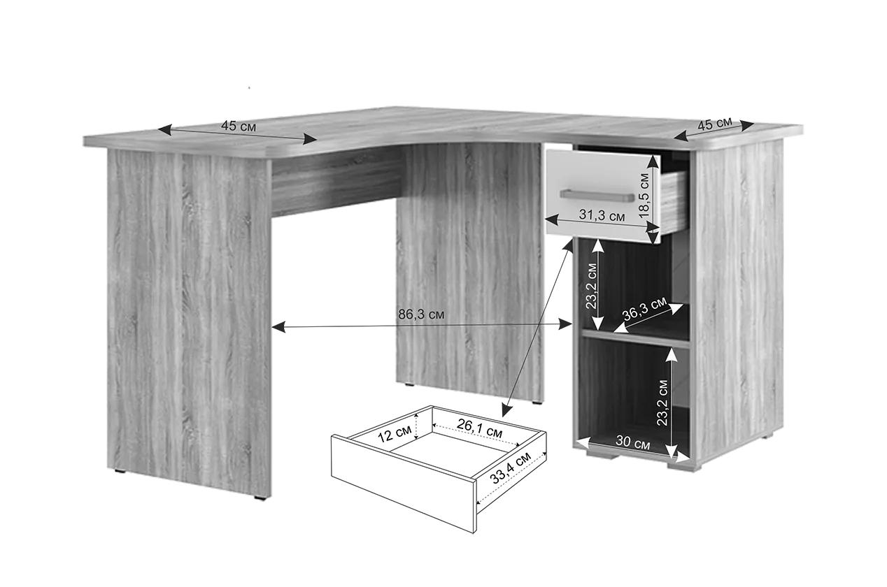 Просторный угловой компьютерный стол Лайт-1: отличный выбор для организации рабочего места в домашнем кабинете или комнате школьника. Этот стол обеспечивает массу рабочего пространства благодаря двум столешницам длиной 1200 мм. Удобство использования гарантировано благодаря округленным углам столешницы, что минимизирует вероятность травм.