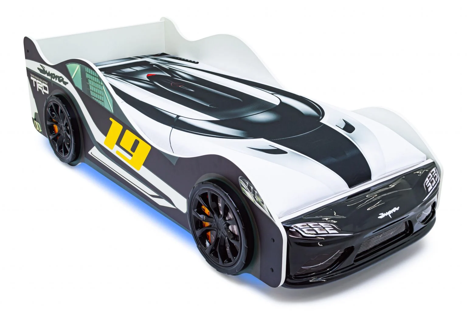Каркас кровати выполнен из экологичного ЛДСП класса эмиссии Е1, соответствует всем стандартам качества. Кровать оборудована объемным бампером из ABS-пластика, к нему прилагаются наклейки в виде фар, радиаторной решётки и логотипа автомобиля. Все края кровати покрыты кромкой ПВХ 1 мм и безопасны для малышей.