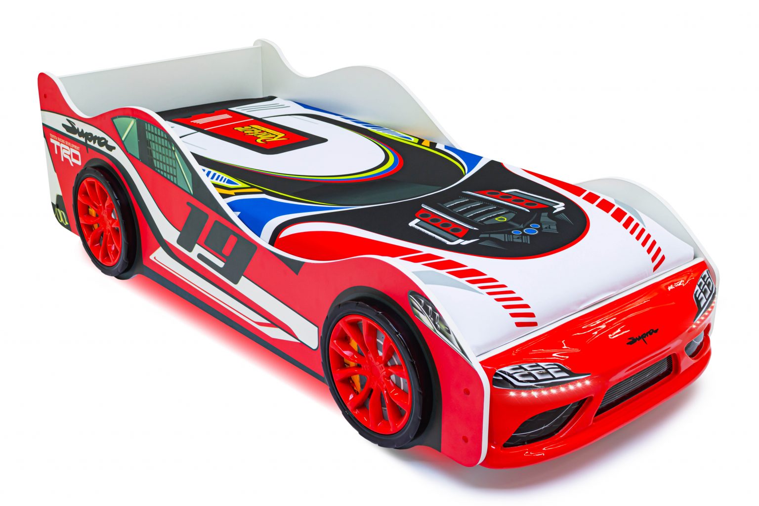 Детская кровать-машина “Супра” красная с подсветкой фар станет любимым местом для сна и игр мальчика или девочки от 2 до 10-12 лет.