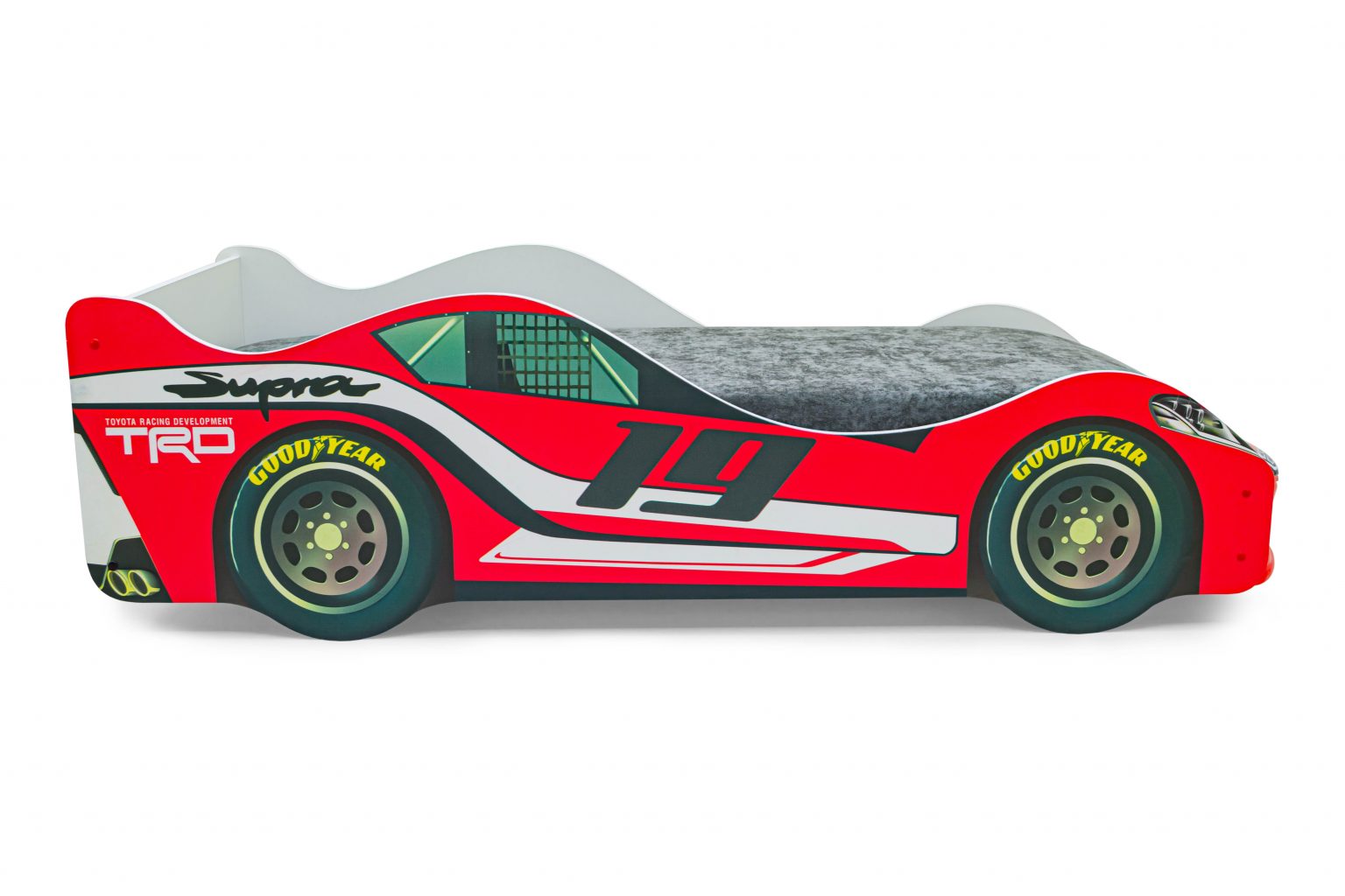 Каркас кровати выполнен из экологичного ЛДСП класса эмиссии Е1, соответствует всем стандартам качества. Кровать оборудована объемным бампером из ABS-пластика, к нему прилагаются наклейки в виде фар, радиаторной решётки и логотипа автомобиля. Все края кровати покрыты кромкой ПВХ 1 мм и безопасны для малышей.