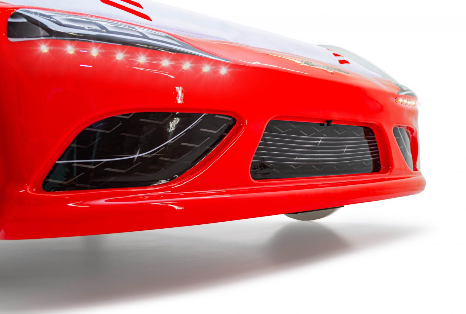 Подсветка фар состоит из 18 светодиодов, встроенных в бампер. Работают от двух батареек АА. Включаются и выключаются с помощью кнопки на бампере.