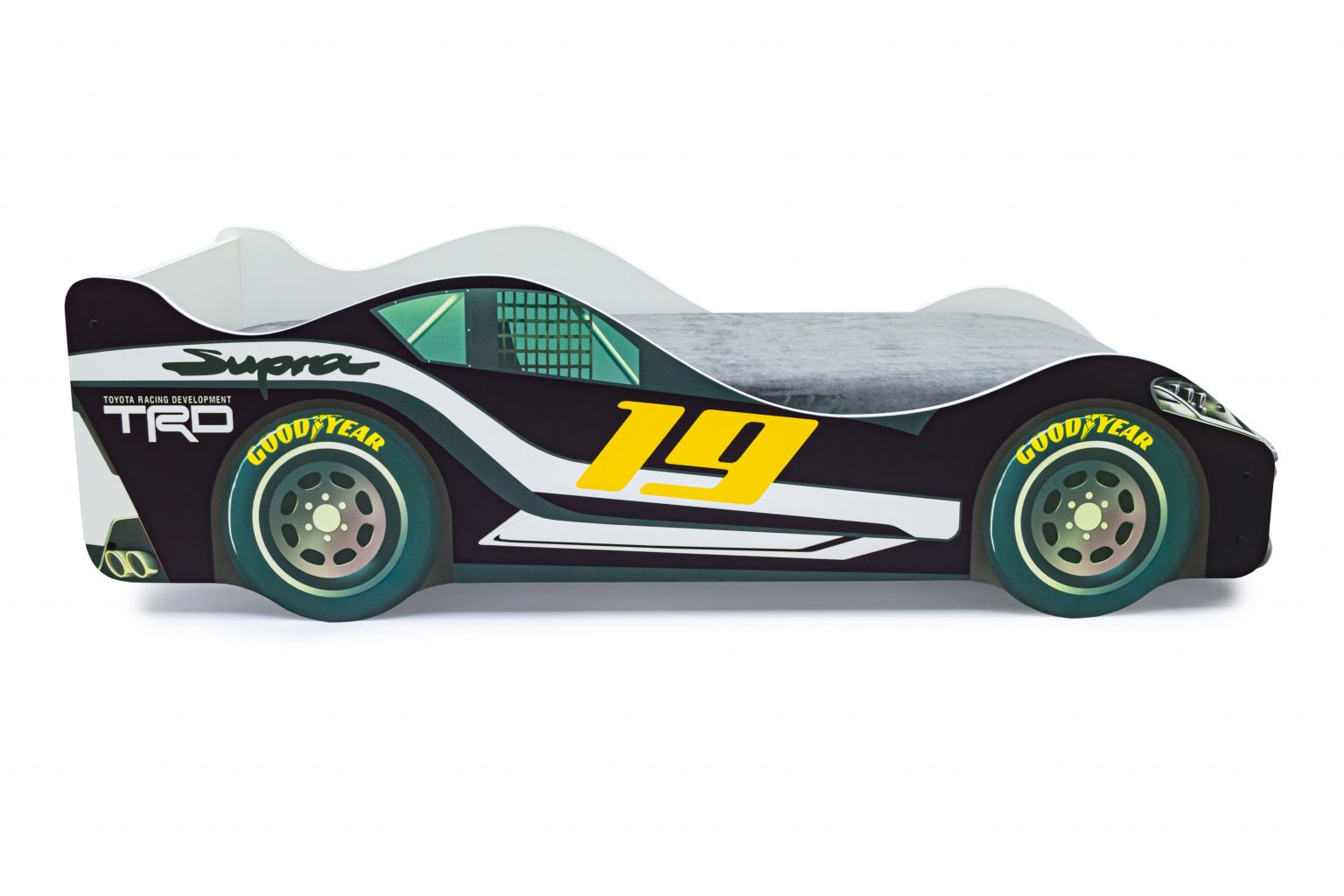 Каркас кровати выполнен из экологичного ЛДСП класса эмиссии Е1, соответствует всем стандартам качества. Кровать оборудована объемным бампером из ABS-пластика, к нему прилагаются наклейки в виде фар, радиаторной решётки и логотипа автомобиля. Все края кровати покрыты кромкой ПВХ 1 мм и безопасны для малышей.