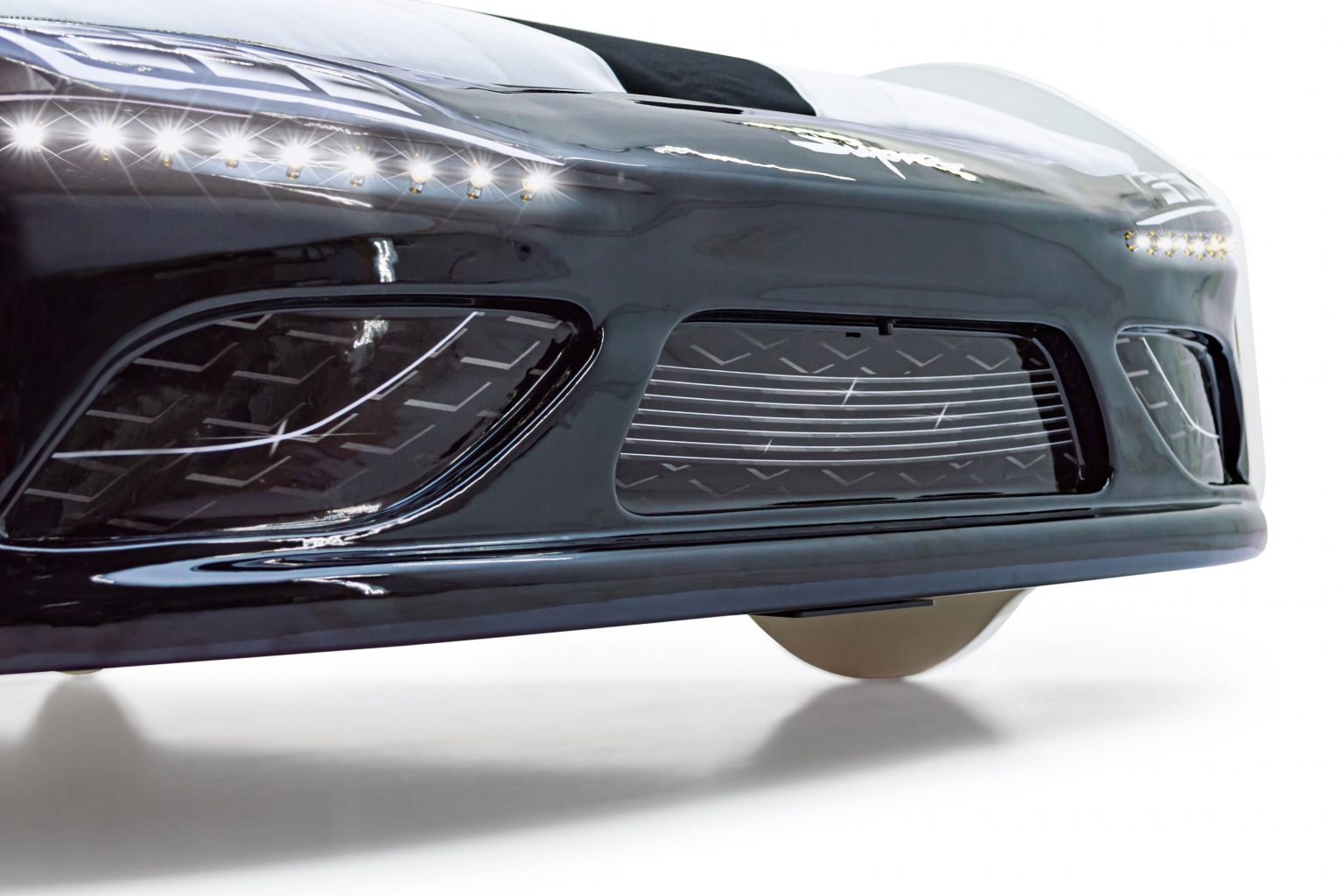 Подсветка фар состоит из 18 светодиодов, встроенных в бампер. Работают от двух батареек АА. Включаются и выключаются с помощью кнопки на бампере.