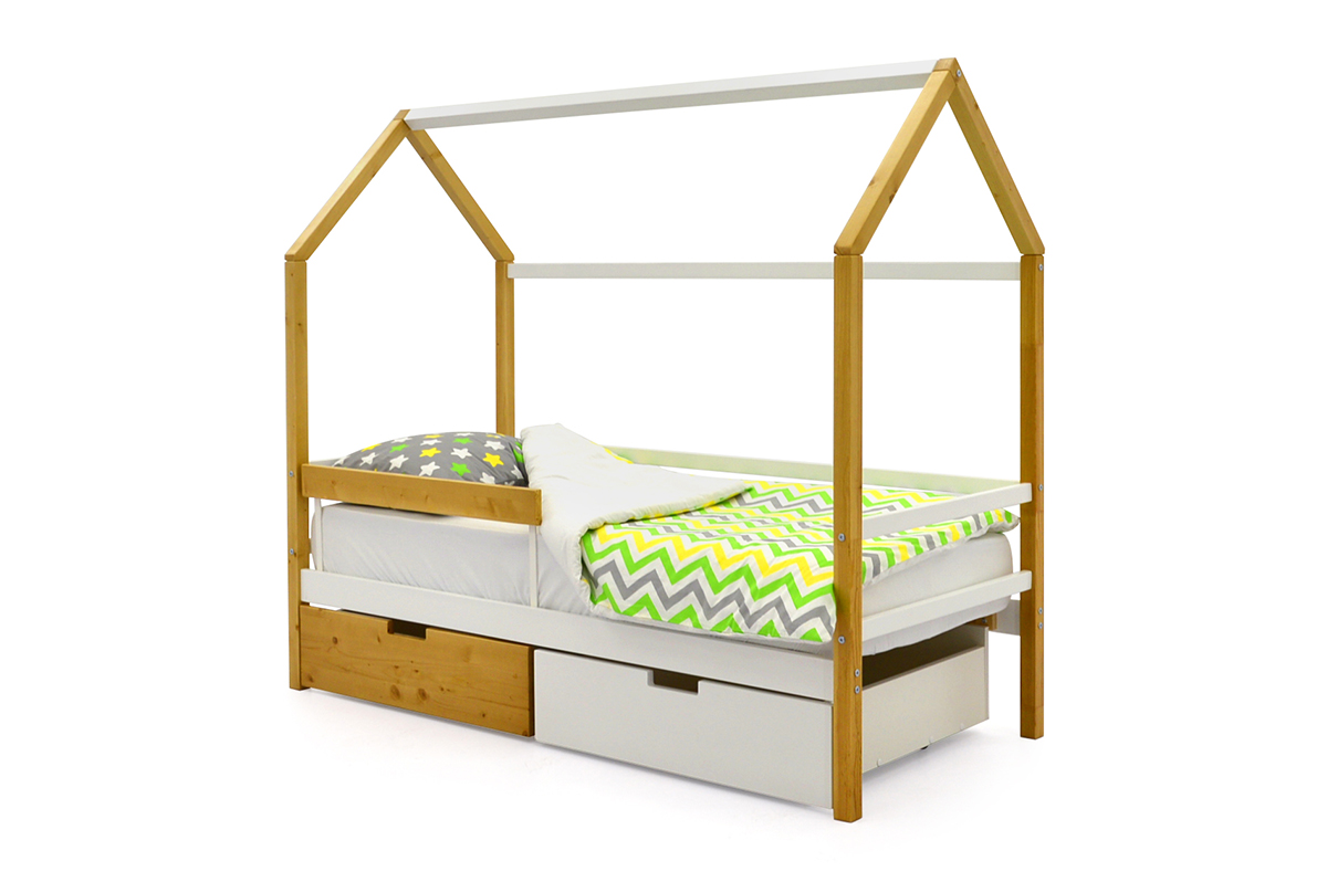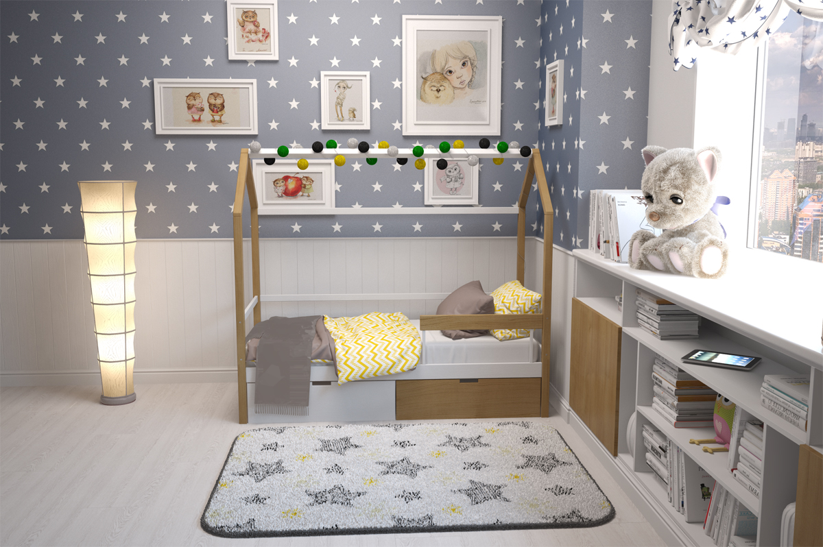 Кровать-домик легко превращается в целый замок для игр с помощью разноцветных тематических игровых накидок. Текстильная крыша на домике создаст ребенку уют и защищенное пространство.