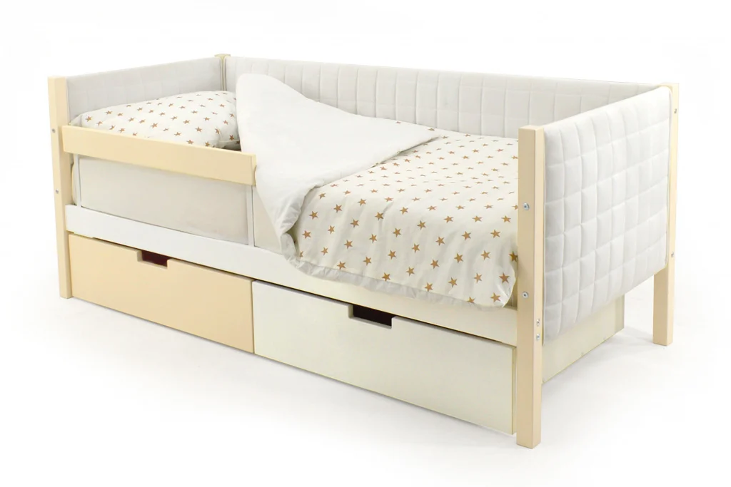 Кровать оборудована манежным бортиком, который защищает малыша от падения во время игр. А для обеспечения дополнительной безопасности малыша во время сна можно приобрести съемный бортик. Особенность его в том, что он закрывает кровать не по всей длине, а только ее часть, благодаря такому конструктиву, ребёнок легко сможет сам забираться на свое спальное место.