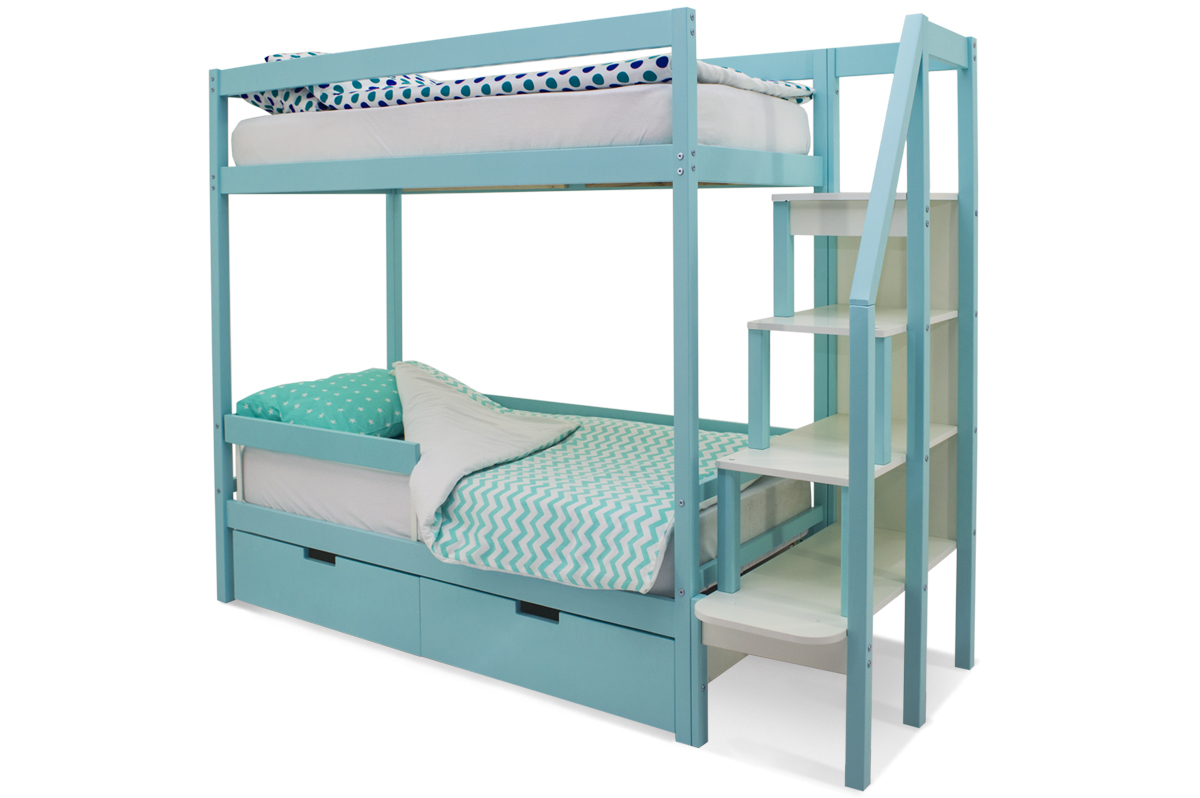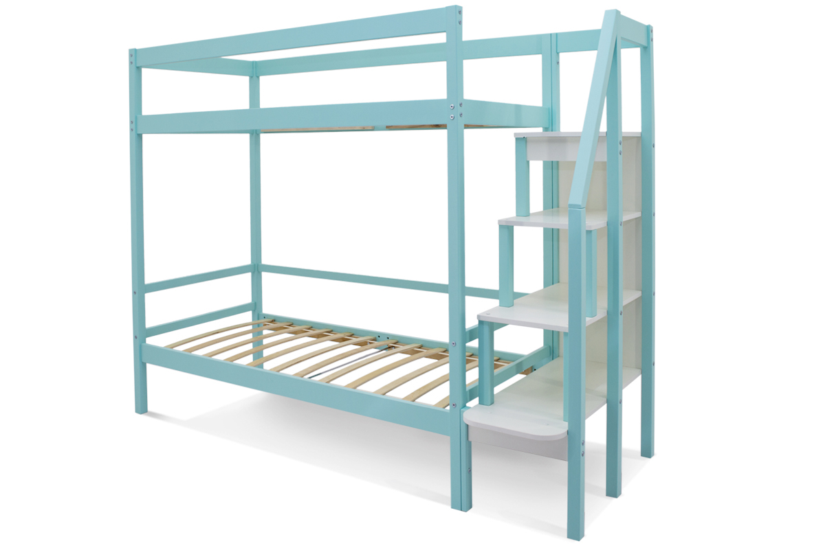 Каждый ярус оборудован специальными бортиками, защищающими от случайного падения. Кровать оборудована практичной лестницей-стеллажом. Полки можно использовать для игрушек, книг, ночника. Лестницу легко зафиксировать как справа, так и слева от кровати, что очень удобно. На каждом ярусе установлено прочное ортопедическое основание из 12 лат. Спальное место выдерживает нагрузку до 200 кг. При создании кровати использовался экологически чистый, практичный материал – массив сосны. Поверхность покрыта гипоаллергенной эмалью.