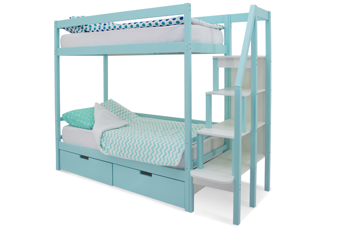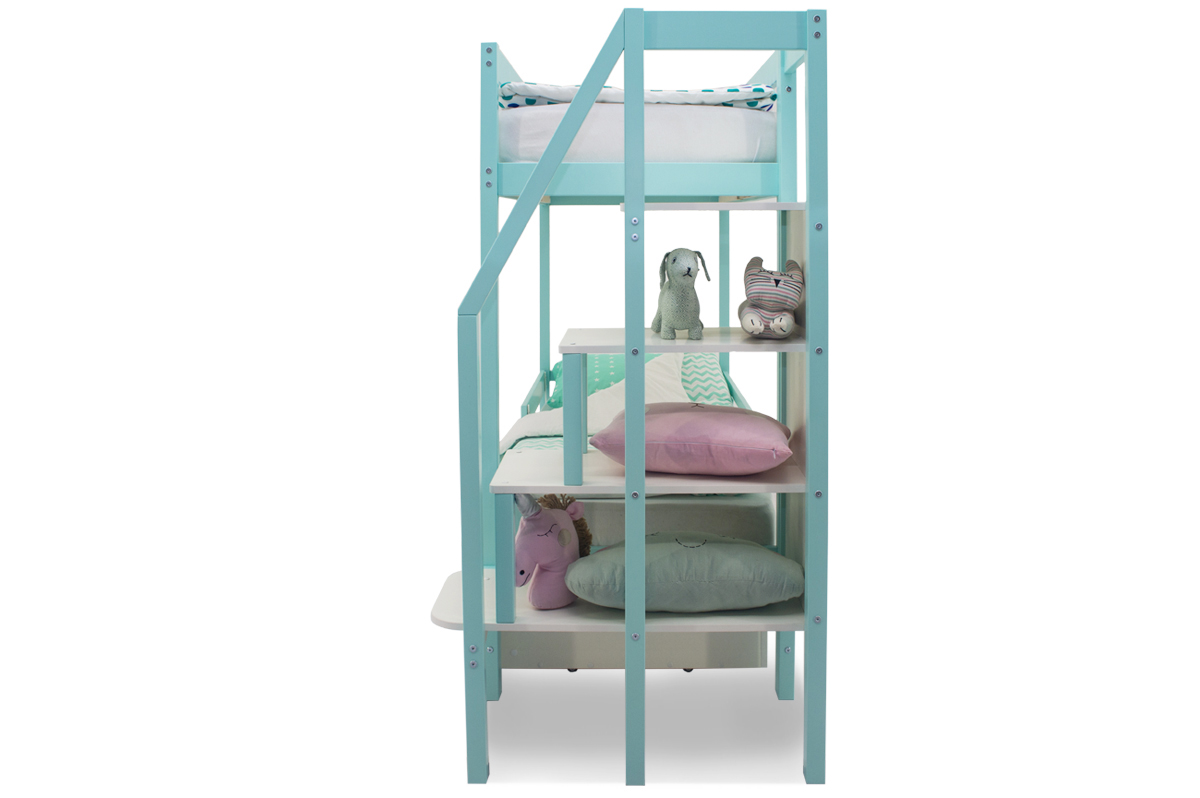 Мятная двухъярусная кровать “Svogen мятный” выполнена по всем стандартам: между двумя спальными местами оптимальное расстояние – 75 см, ребёнку будет комфортно сидеть на нижнем ярусе, не упираясь головой в верхний ярус. Габариты кровати весьма компактные, что позволяет сэкономить пространство комнаты. Кровать подходит для мальчиков и девочек в возрасте до 12 лет.