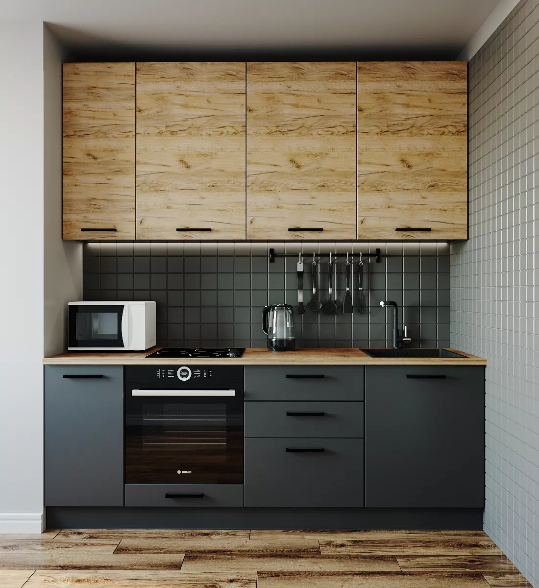 Фасады верхних модулей со свесом 12 мм дают возможность использовать без установки ручек.