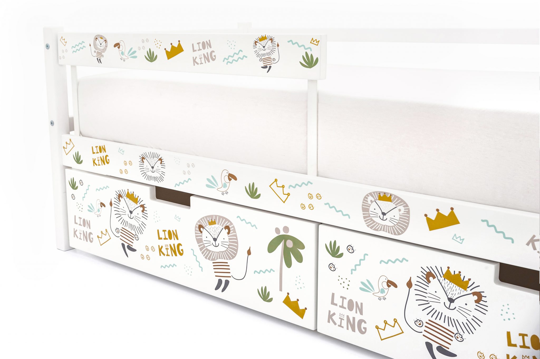 Ящики на колесиках удобны, когда нужно помыть полы под кроваткой или переставить ее с легкостью на другое место. Ребенок сможет самостоятельно при необходимости выдвинуть и задвинуть ящик. Ящик объемом 0,6 куб.м. отлично подойдёт для хранения постельного белья, игрушек и других вещей. Большой выбор цветовых решений фасадов ящика позволят создать свою идеальную кровать.