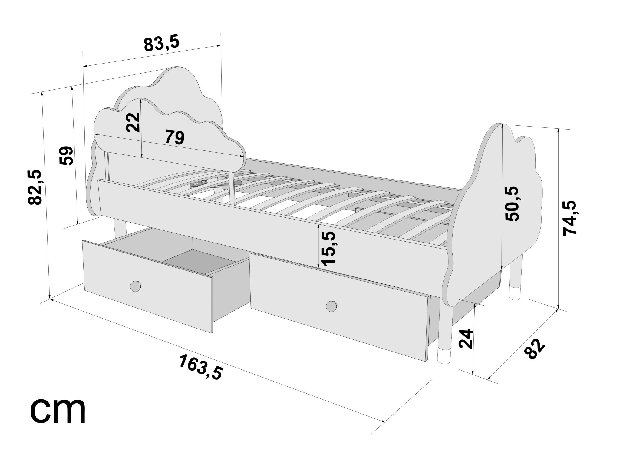 Изголовье и изножье кроватки сделаны в виде облака. Высота от пола до самого высокого места составляет 66 см. Это позволяет даже маленькому ребенку комфортно забираться и спускаться с нее, не рискуя упасть. Специальная конструкция кровати позволяет с лёгкостью присесть или прилечь рядом взрослому, если ребенок не может заснуть.