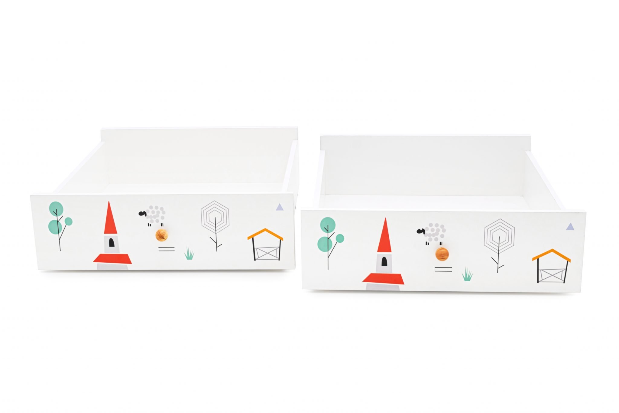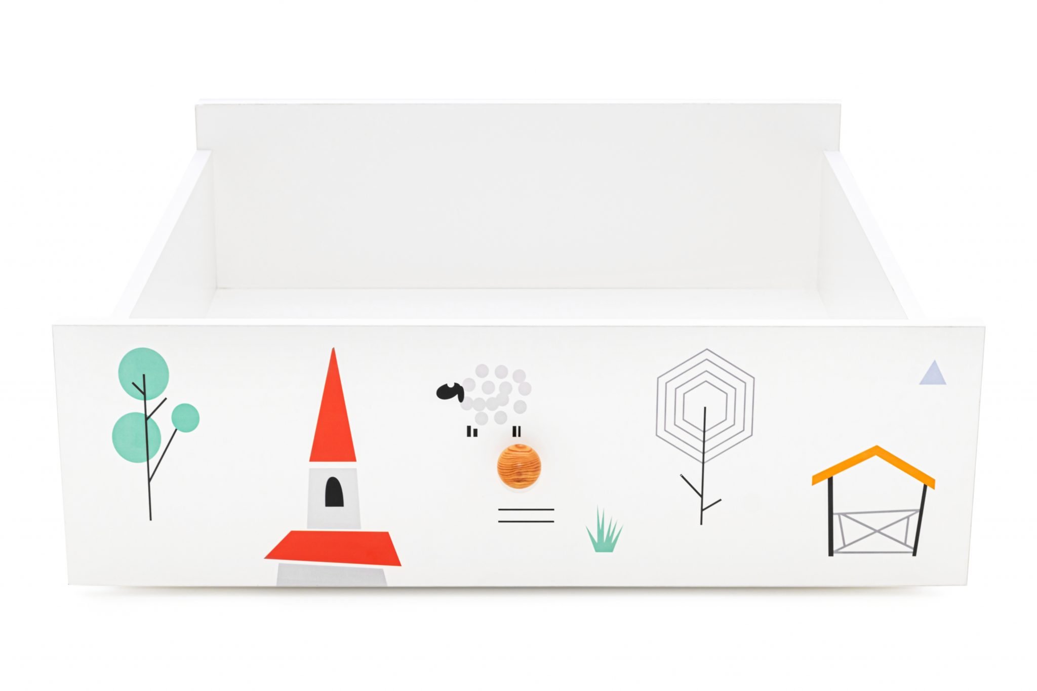 Ящики на колесиках удобны, когда нужно помыть полы под кроваткой или переставить ее с легкостью на другое место. Ребенок сможет самостоятельно при необходимости выдвинуть и задвинуть ящик. Ящик объемом 0,6 куб.м. отлично подойдёт для хранения постельного белья, игрушек и других вещей. Большой выбор фотопечати на фасадах ящика позволят создать свою идеальную кровать.