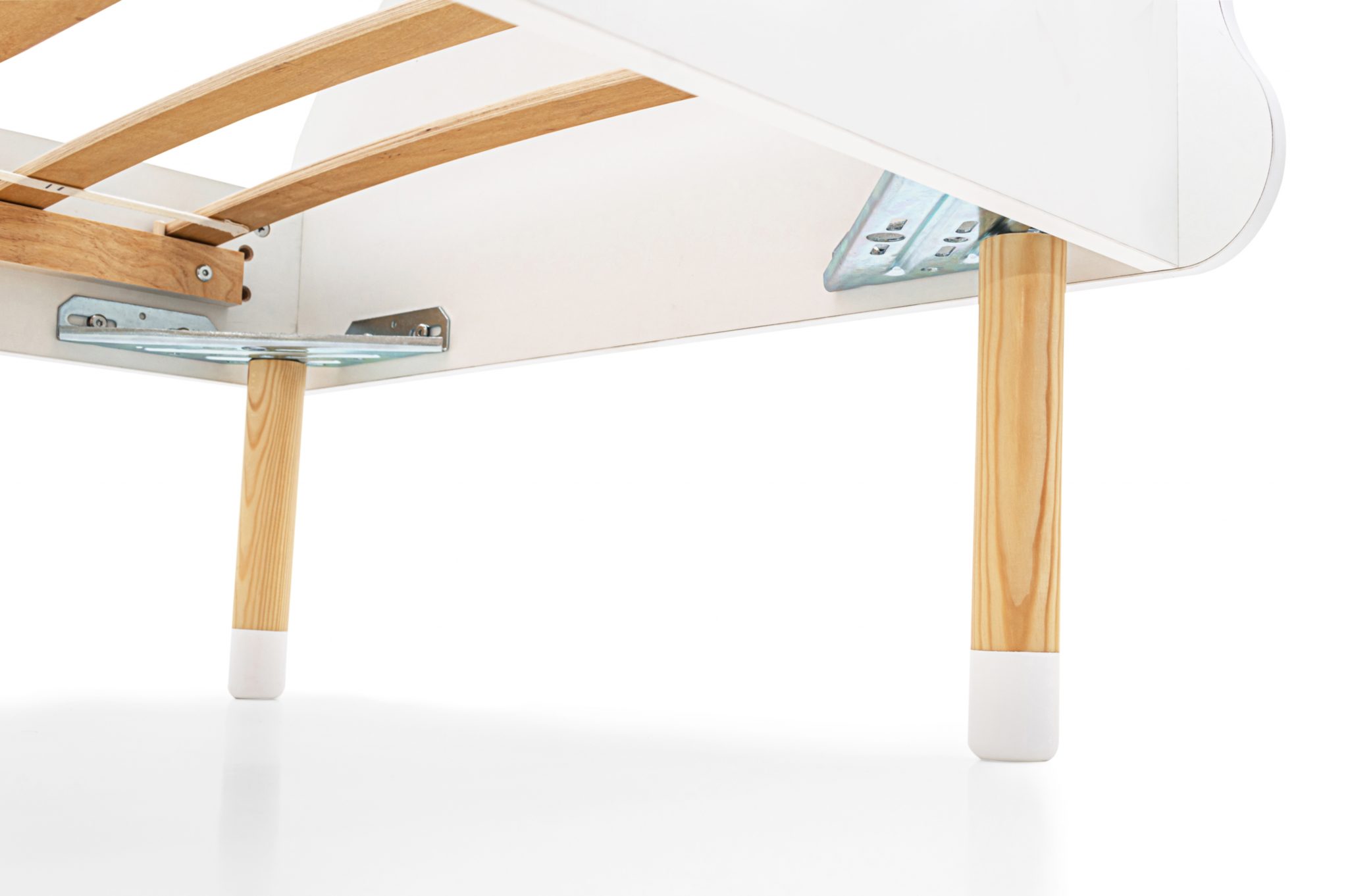 Кровать изготовлена из ЛДСП класса Е1, а ножки изготовлены из массива сосны, отшлифованы и покрыты лаком на водной основе. Эти материалы обладают высокой прочностью, долговечностью, просты в уходе.