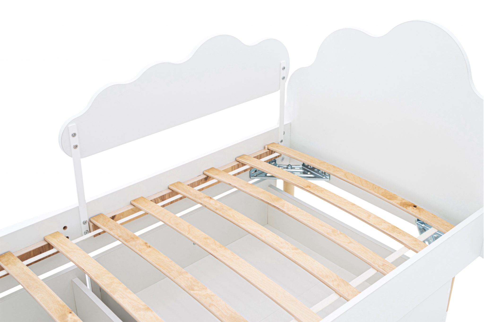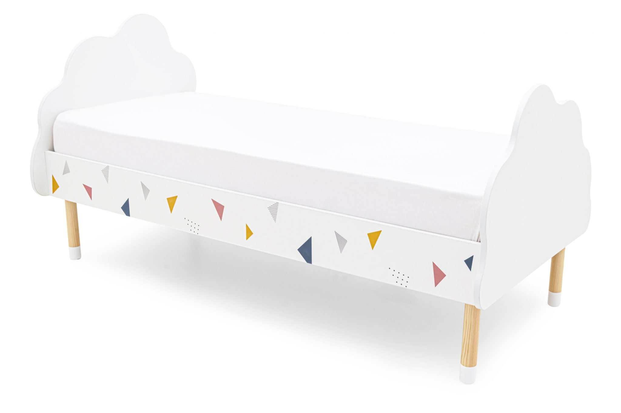 Изголовье и изножье кроватки сделаны в виде облака. Высота от пола до самого высокого места составляет 66 см. Это позволяет даже маленькому ребенку комфортно забираться и спускаться с нее, не рискуя упасть. Специальная конструкция кровати позволяет с лёгкостью присесть или прилечь рядом взрослому, если ребенок не может заснуть.