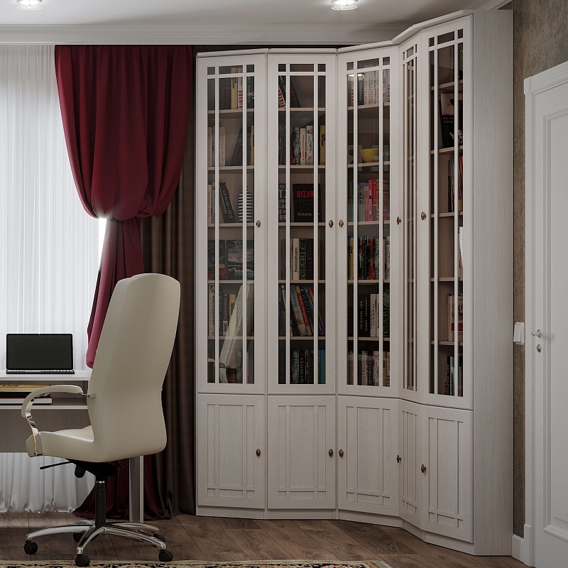 Высокий книжный шкаф можно установить в комнату с высотой потолка не менее 240 см. Высота полок во всех шкафах для книг регулируется, для этого только необходимо установить полкодержатели в подготовленные отверстия. Это позволит поставить на полки книги и альбомы разного формата. Тонированное стекло защищает книги от вредного воздействия солнечных лучей и убережет их от пожелтения. Книжный шкаф обязательно крепится к стене за подвесы и межсекционной стяжкой с другими шкафами в наборе. Библиотека выпускается без выборки под плинтус, чтобы каждый мог прирезать плинтус индивидуально. В противном случае остаются неаккуратные зазоры между модулем и стеной.