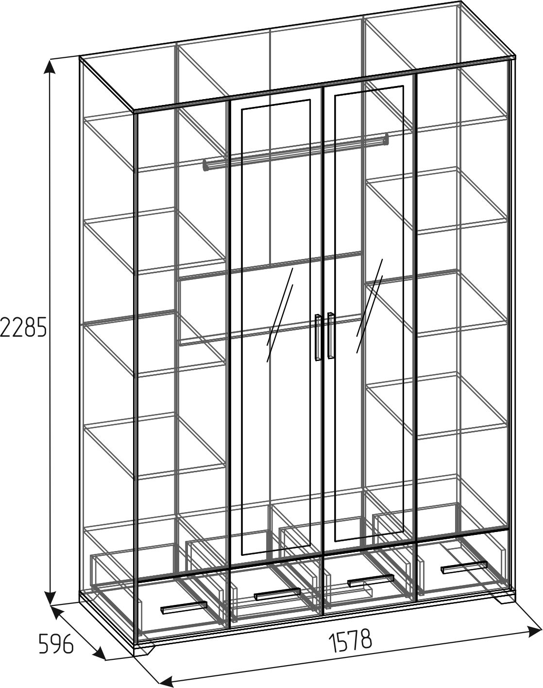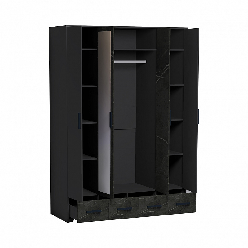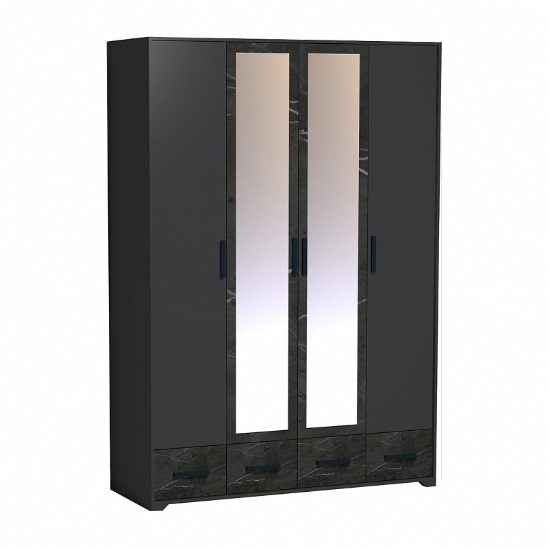 Четырехдверный шкаф для одежды и белья Айрис 555 с зеркалами и выдвижными ящиками - настоящая находка для большой и маленькой квартиры. Шкаф оснащен отделениями для хранения белья с полками на скрытых полкодержателях и отделением для одежды со стационарной штангой длиной 749 мм. Штанга выдерживает нагрузку до 40 кг. 4 выдвижных ящика комплектуются шариковыми направляющими. Такой шкаф с ящиками сможет заменить полноценный комод в маленькой спальне.