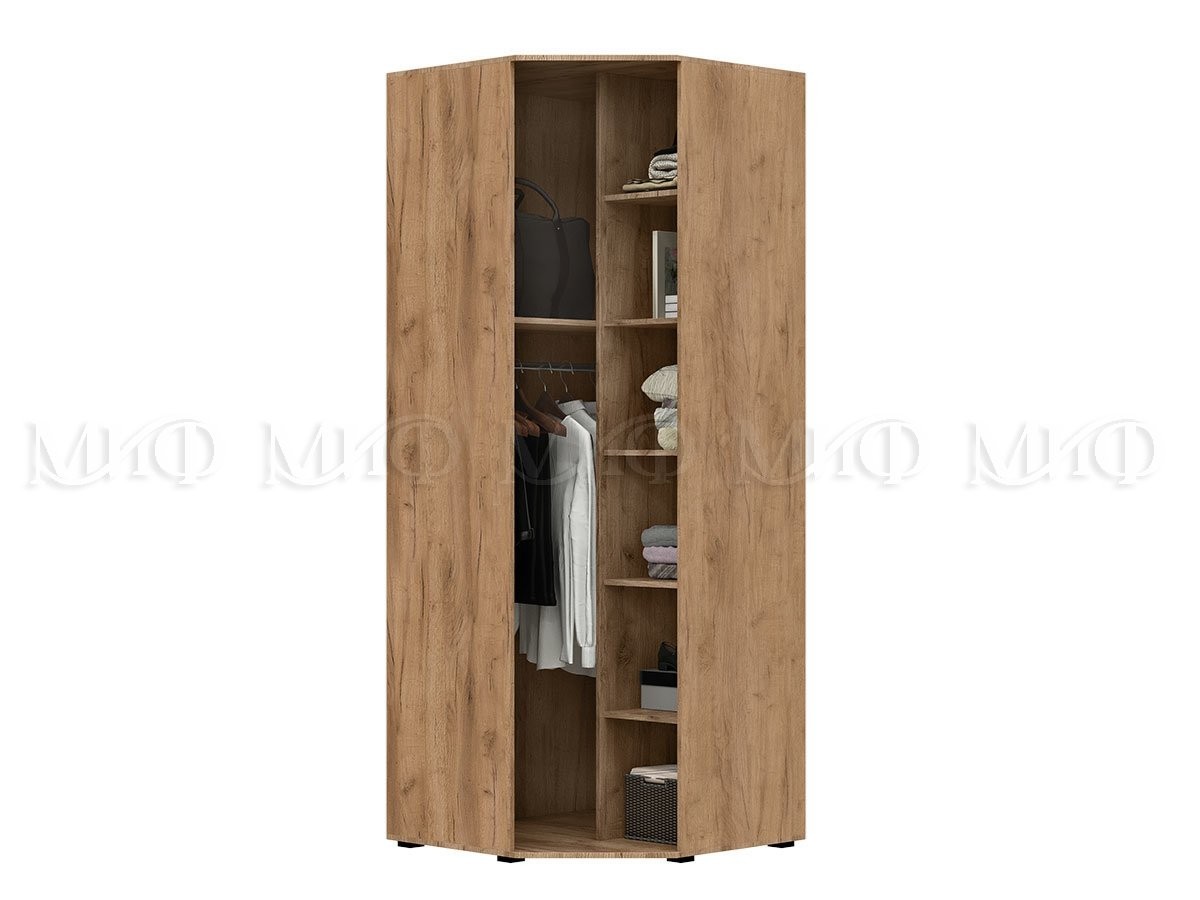 Шкаф Соренто предназначен для тех, кто любит практичность и комфорт. С угловым шкафом получится максимально использовать пространство в комнате, задействовав место в углу. Внутри модуль разделен на две функциональные зоны. Секция с тремя полками подходит для хранения одежды в сложенном виде, а на штанге в другой половине шкафа можно разместить одежду на вешалках-плечиках. Широкая полка, расположенная над штангой, удобна для хранения коробок.
