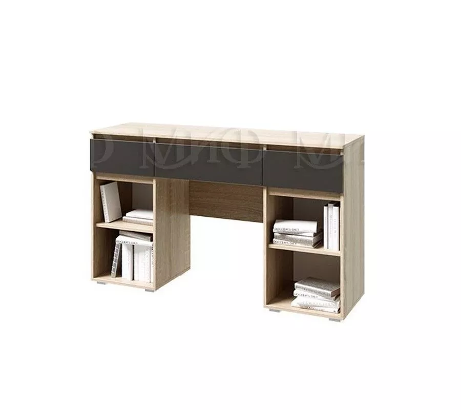 Лаконичной формы комфортный современный туалетный стол с тремя выдвижными ящиками в подстолье и двумя тумбами с полками за распашными дверцами. Ящики и дверцы тумб открываются благодаря фасадным выступам. Выдвижные ящики оснащены роликовыми направляющими. В основании стола - квадратные низкие опоры.