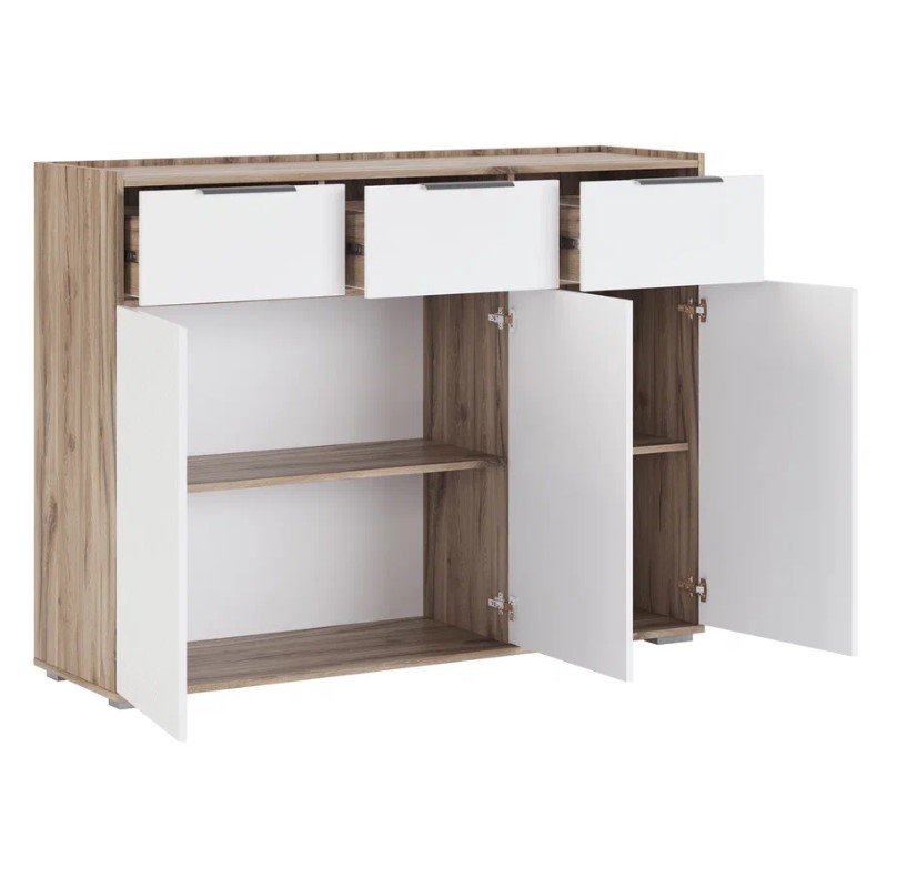 Греденция имеет три выдвижных ящика на шариковых направляющих полного выдвижения и три распашных фасада на петлях фирмы "Titus" (Словения) с системой открывания "Push to open";