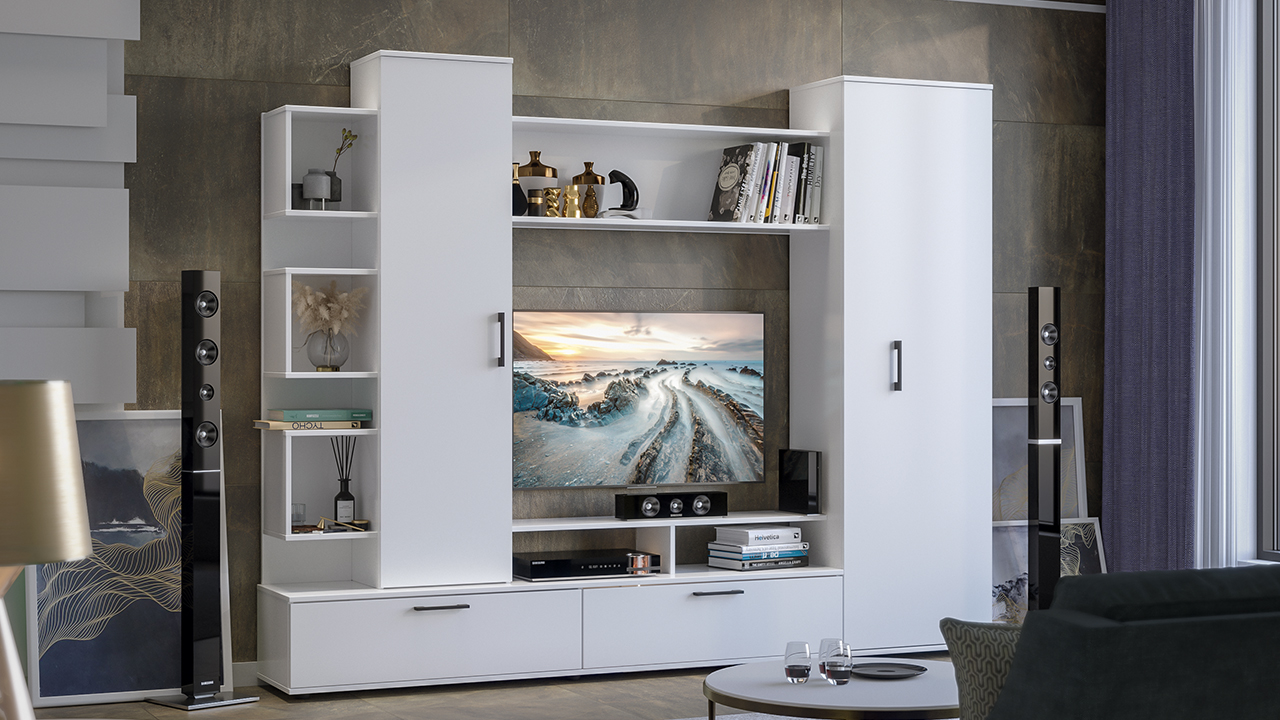 Удобная ниша под TV имеет размер: 1100 х 252 х 916 мм, а открытая полка под нишей позволит хранить различные аксессуары.