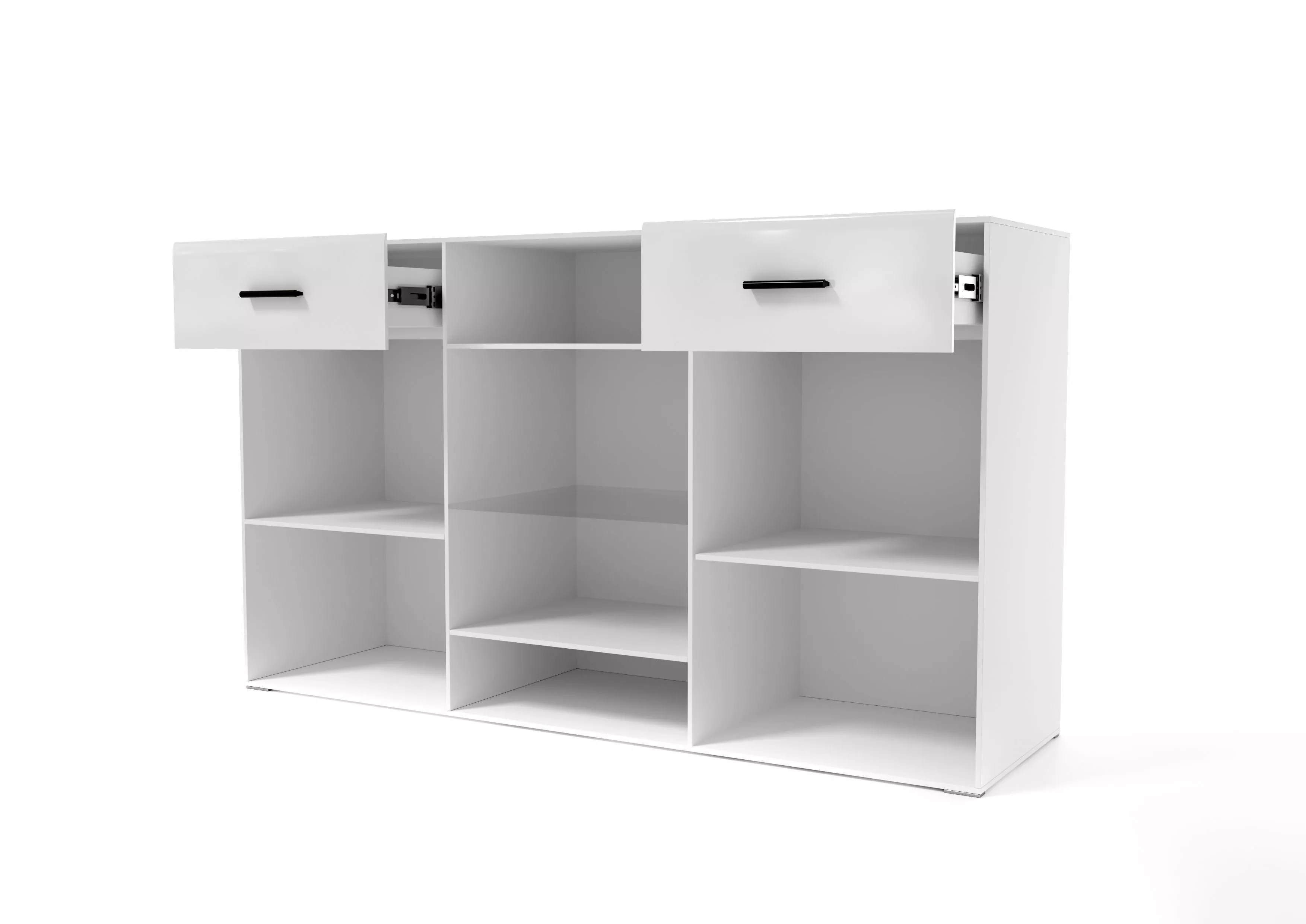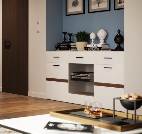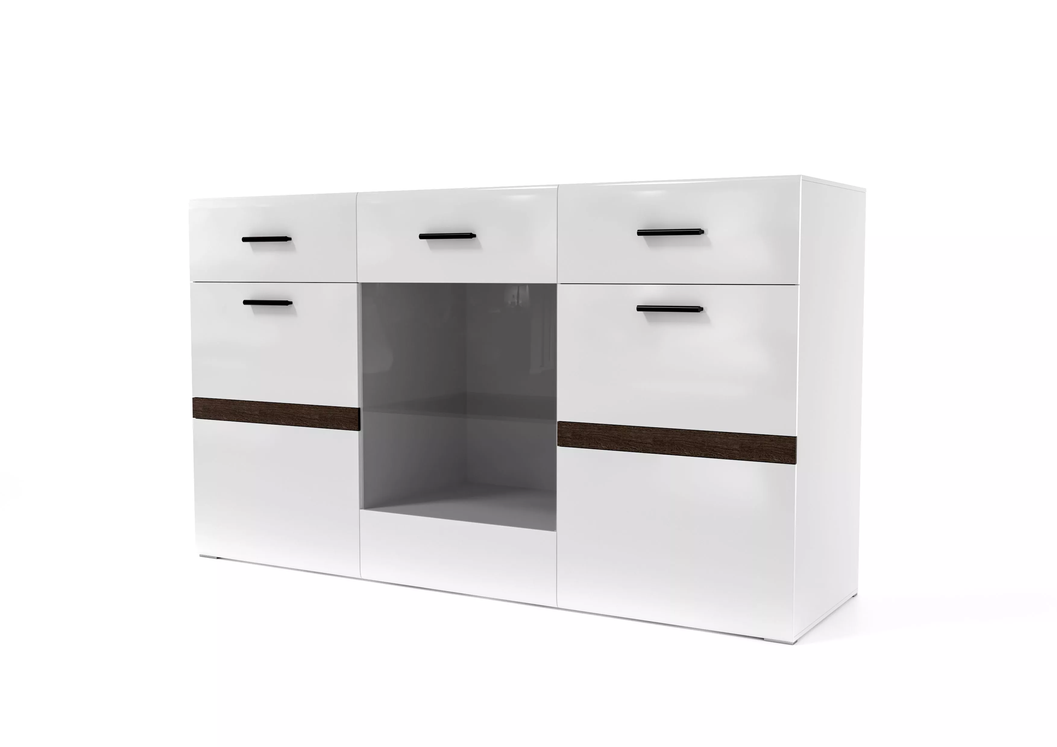 Комод разделен вертикальными перегородками на три отделения. В отделениях по краям предусмотрено по одному выдвижном ящику с телескопическими направляющими полного выдвижения и по одному отделению с глухой распашной створкой. В каждом из отделений установлено по одной съемной полке. Центральное отделение комплектуется составной стеклостворкой с серым тонированным стеклом и стеклянной полкой. При этом в центральном отделении также предусмотрены одна стационарная и одна съемная полки. Средняя створка открывается только слева-направо.