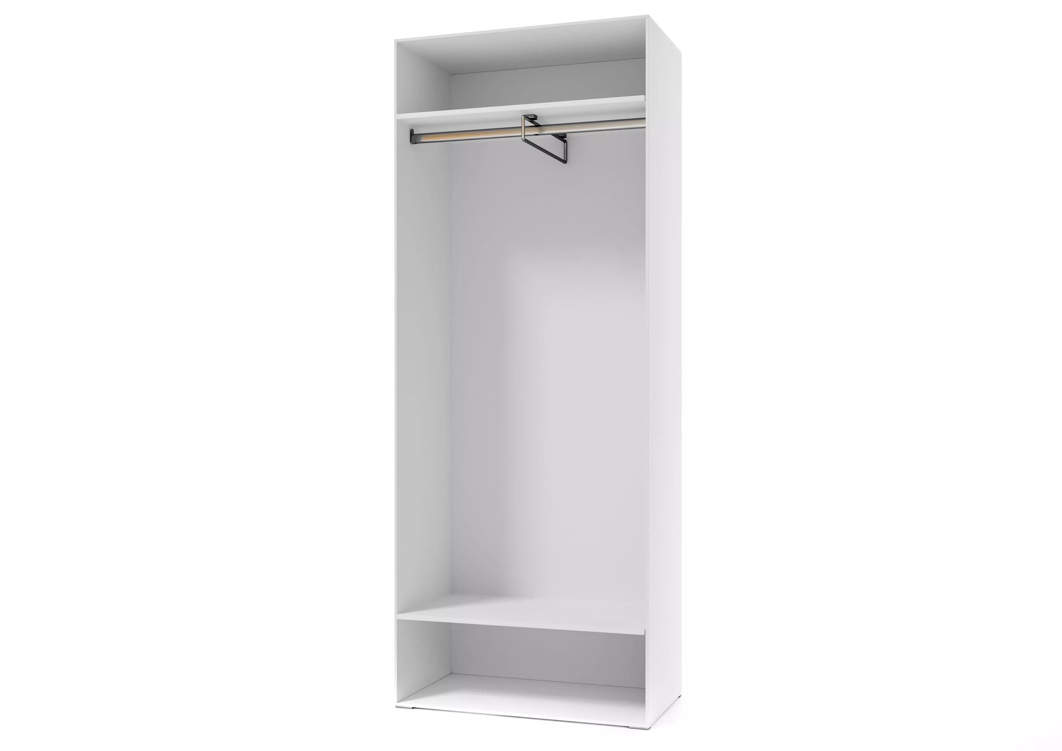 Шкаф комплектуется двумя стационарными полками вверху и внизу и выдвижной евроштангой. Также в комплект шкафа входят металлическая штанга и штангодержатели. Створки шкафа универсальные. В качестве дополнительного оборудования, к шкафу можно дозаказать комплект из 3-х полок размером 786*16*408 мм. Для установки дополнительных полок в боковинах шкафа предусмотрена присадка под полкодержатели.