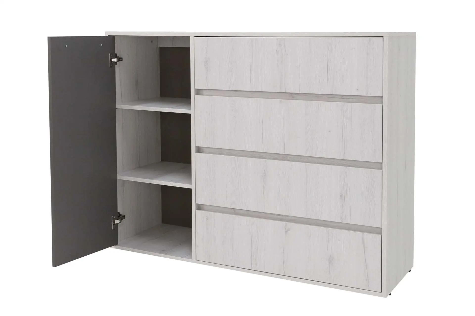 Комод сделан в современном стиле для подростковой комнаты. 4 выдвижных ящика могут уместить в себя достаточно большое количество вещей, а 3 дополнительные полки помогут скрыть оставшийся визуальный шум.