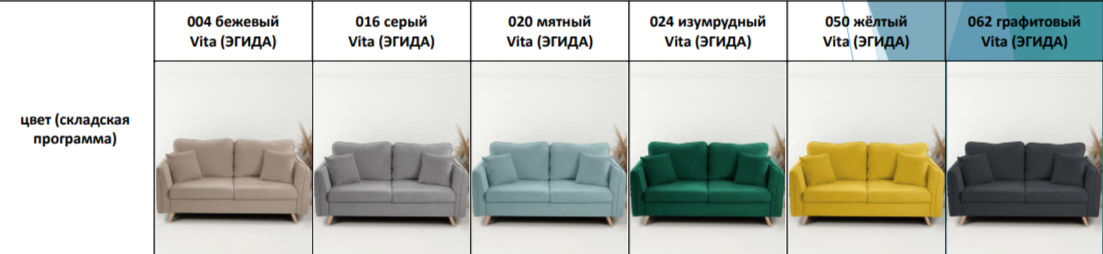 Складские цвета: 004 бежевый Vita, 016 серый Vita, 020 мятный Vita, 024 изумрудный Vita, 025 синий Vita, 040 розовый Vita, 062 графитовый Vita (Эгида)