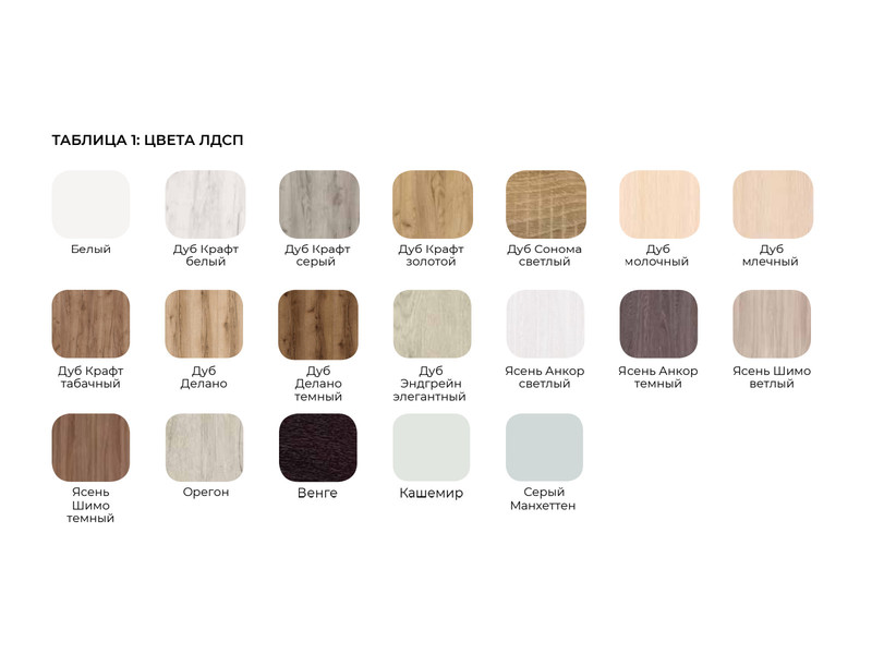 Цвет ЛДСП: Белый, Дуб сонома, Ясень Анкор светлый, Дуб Крафт белый, Дуб Крафт Золотой, Дуб Крафт серый.