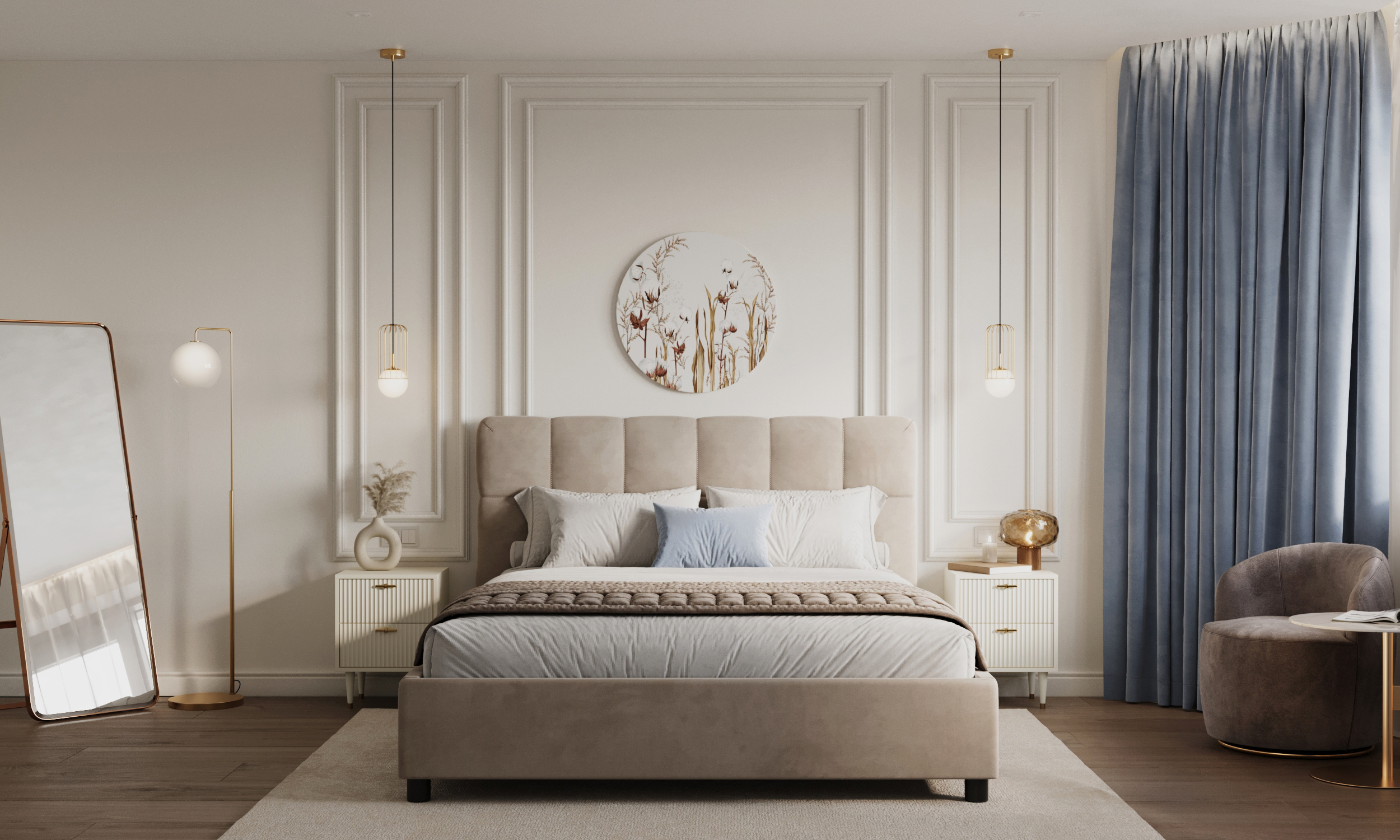 Современная кровать Голди в стиле минимализм с декоративной строчкой на изголовье может быть стилизована в скандинавский стиль спальни или современную классику благодаря лаконичному дизайну изголовья. Высокое изголовье кровати позволит Вам создать органичный комплект с высокими комфортными матрасами. Мягкие царги и углы у изножья уберегут от травм. Высота опор облегчает уборку: под кровать легко заезжает робот-пылесос. При необходимости можно укомплектовать кровать подъемным механизмом, который обеспечит лёгкий доступ к ящику для удобного хранения постельных принадлежностей и прочих вещей. Ортопедическое основание (входит в стоимость) – залог хорошего отдыха и здорового сна. Усиленный крепёж. Конструкция кровати очень прочная и надежная, благодаря использованию качественных материалов.