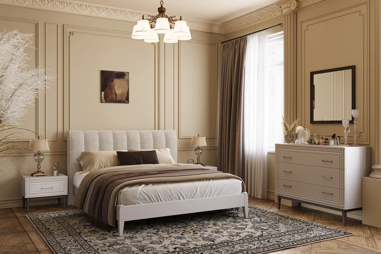 Спокойный мягкий льняной оттенок спальни "Гориция" отлично расширяет пространство, делает комнату уютной, не перегружая обстановку. Изящная фрезеровка на фасадах выглядит стильно и современно. Кровать из массива, тумбы и комоды на элегантных опорах цвета дуб коньяк, вместительные распашные шкафы для одежды - в спальный гарнитур входит все, что нужно для спокойного отдыха и рациональной организации пространства.