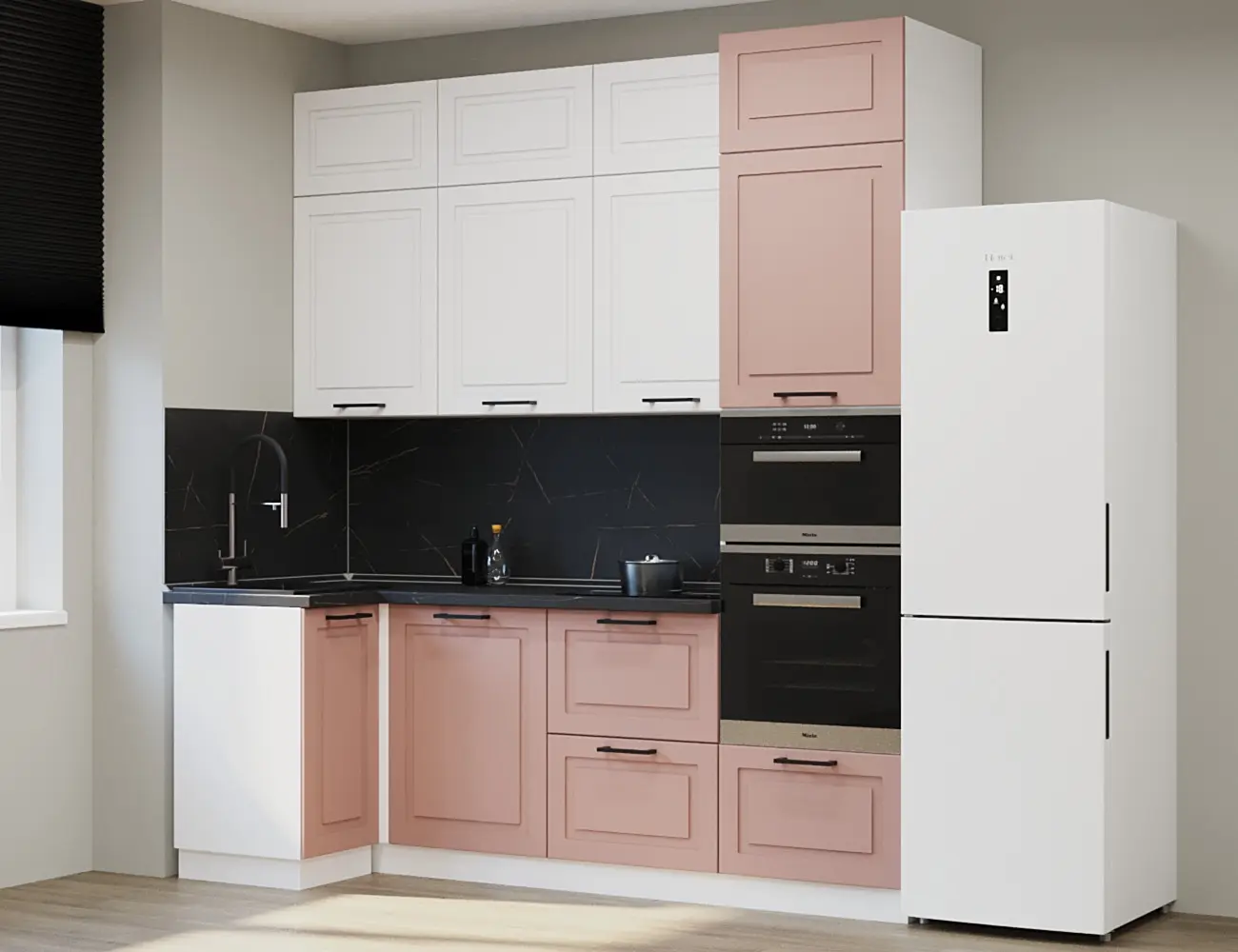 Аликанте 1: Цвет фасада: Шарли Pink, Шарли белый, корпус Серый, столешница 28мм: Каспий черное золото