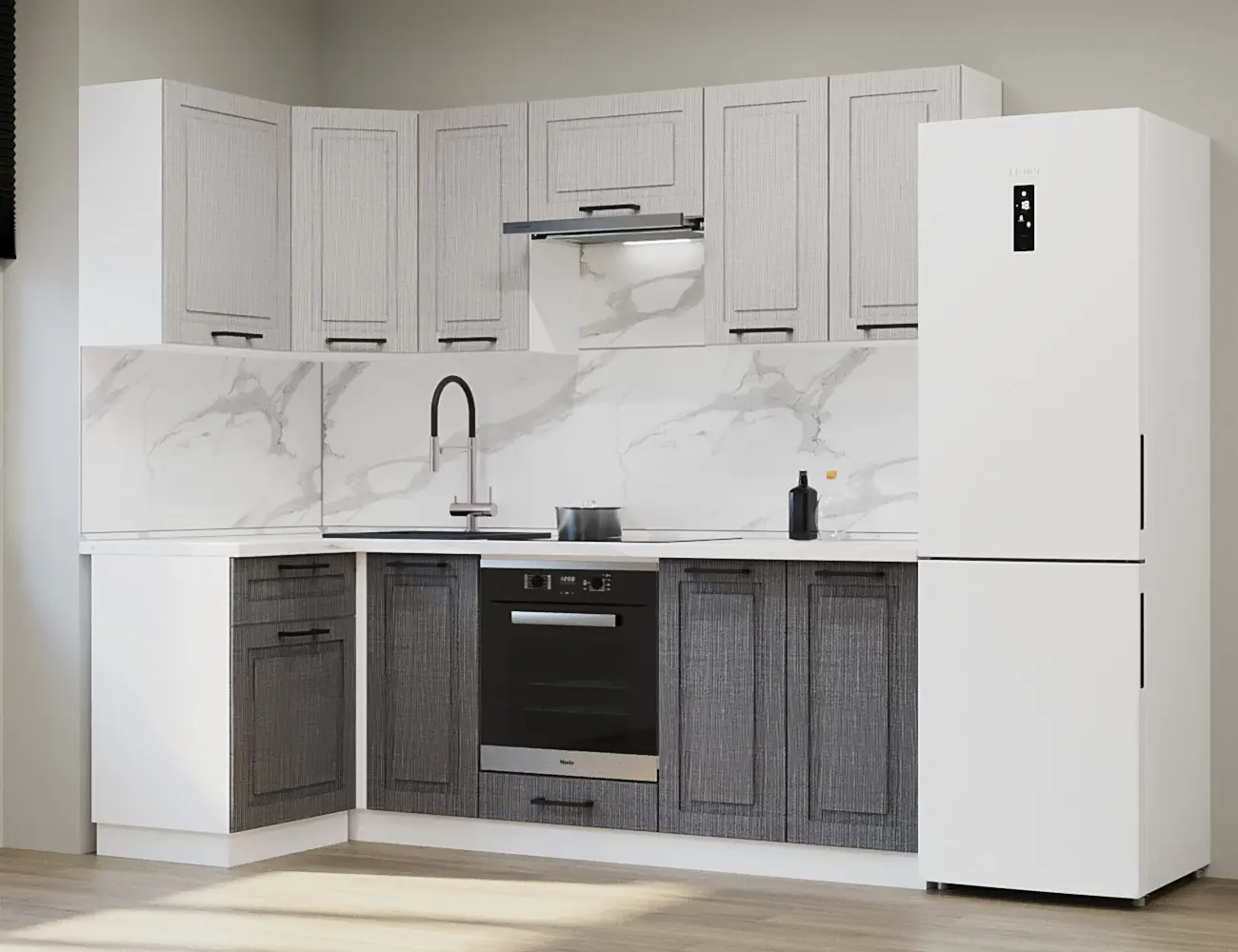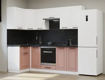 Аликанте 9: Цвет фасада: Шарли Pink, Шарли белый, корпус Серый, столешница 28мм: Каспий черное золото