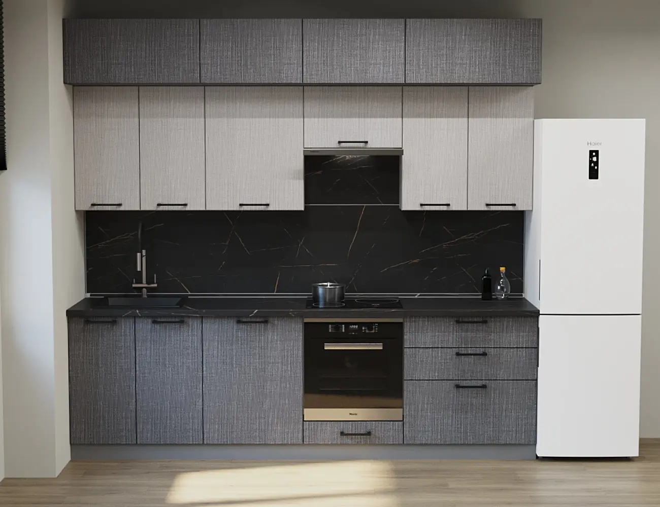 Аликанте 23: Цвет фасада: Шарли Pink, Шарли белый, корпус Серый, столешница 28мм: Каспий черное золото