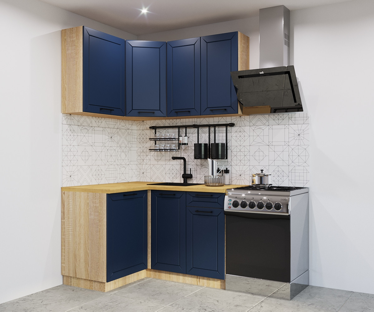 Синяя кухня всегда привлекает к себе восторженные взгляды, преображает окружающую обстановку и делает ее более легкой и свежей. Сдержанный и элегантный тандем в сочетании с грамотно расставленными яркими акцентами, будет смотреться очень уютно. Отличным компаньоном для синего станут корпус и столешница под светлое дерево.