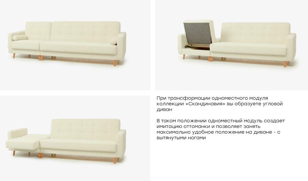 При трансформации одноместного модуля коллекции «Скандинавия» вы образуете угловой диван. В таком положении одноместный модуль создает имитацию оттоманки и позволяет занять максимально удобное положение на диване - с вытянутыми ногами.