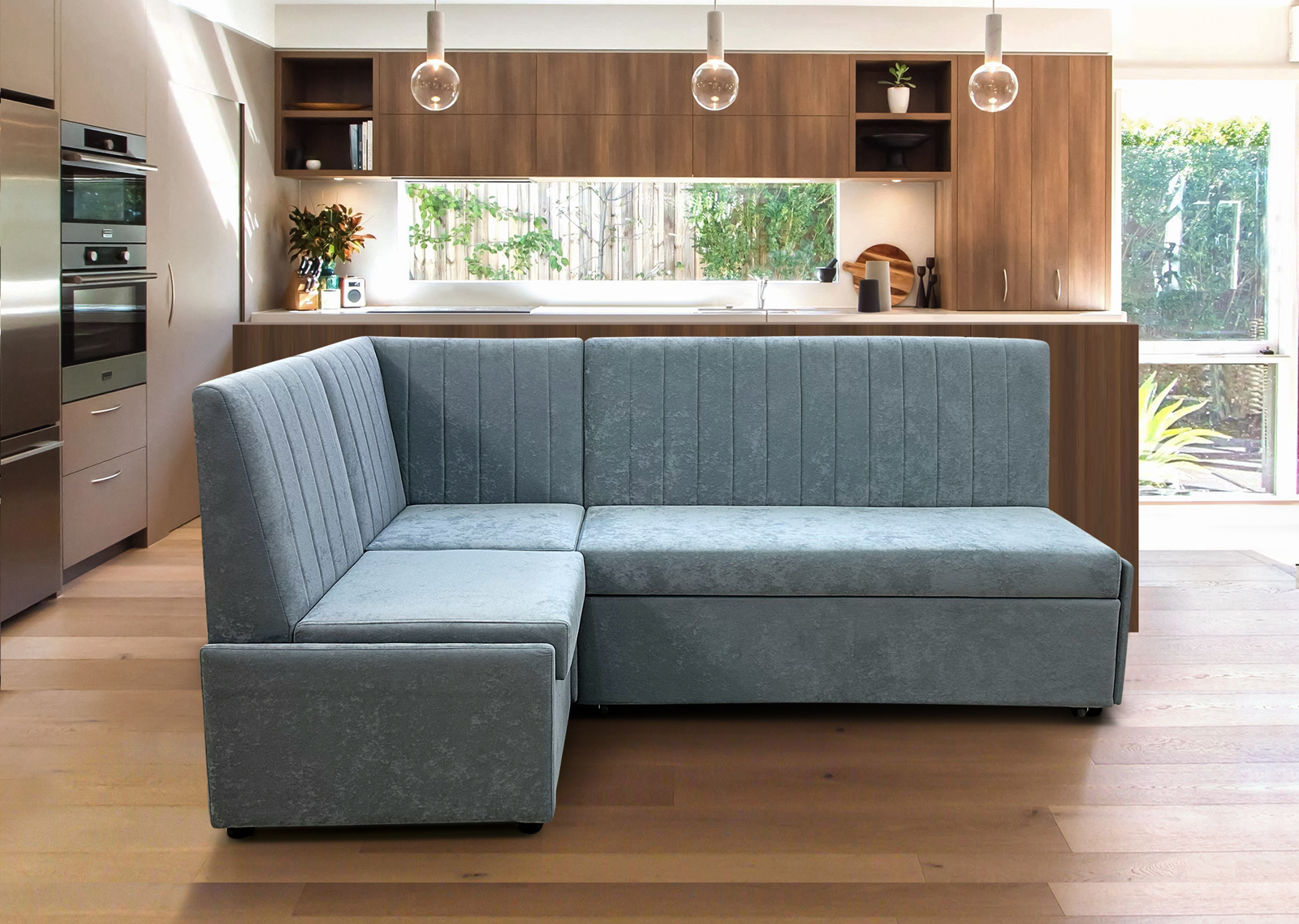 Описание: Модульная мебель предназначена для кухонных помещений. Стандартная комплектация является универсальной и может собираться в домашних условиях, на любую сторону, без применения инструментов. Ящик для хранения вещей. Раскладывается в спальное место, где обивка выполнена из основной ткани. Полка ЛДСП.
