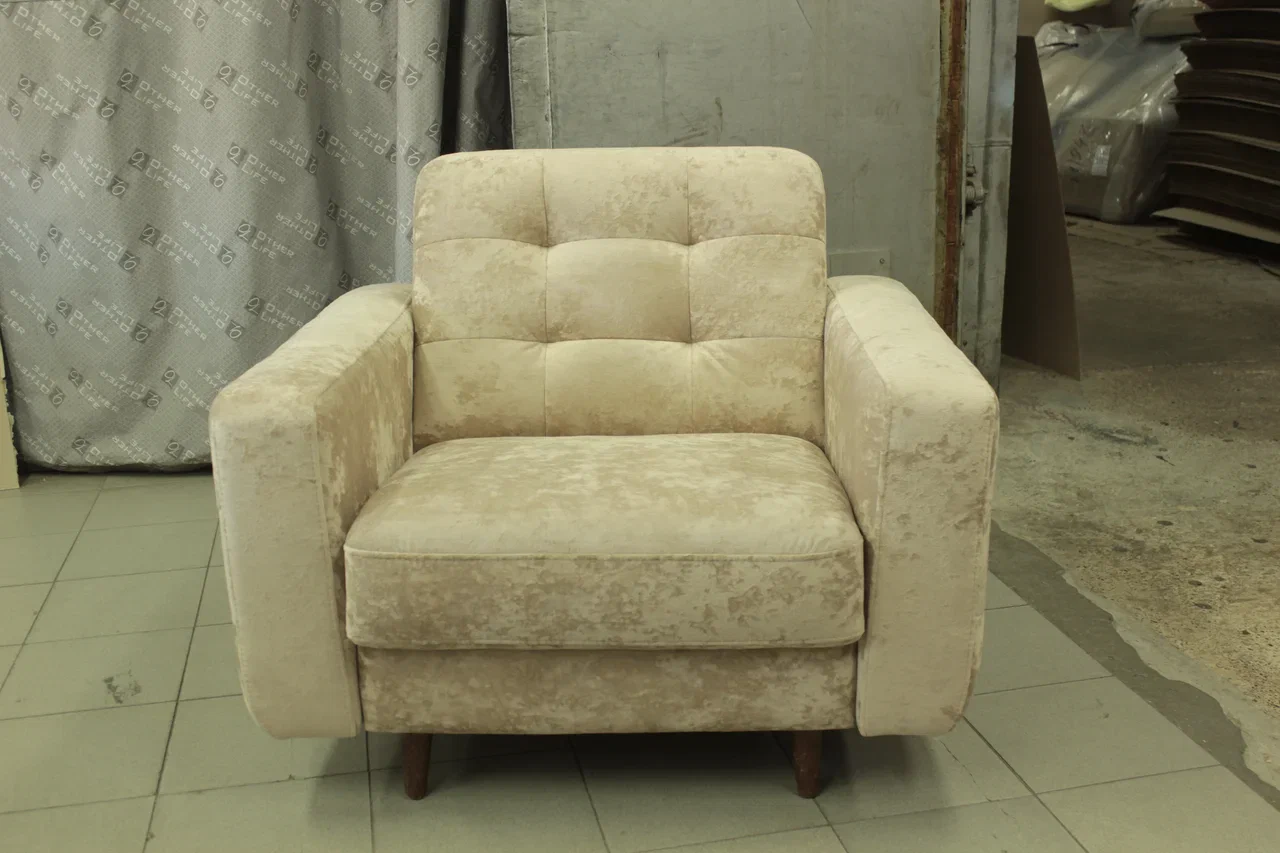Здесь Вы найдете и плавные, но прямые очертания, сдержанную мягкость, интересный рисунок поверхности кресла, состоящий из втяжек и прострочки.