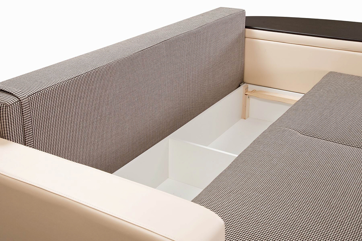 Каркас выполнен из древесины хвойных пород, фанеры и ЛДСП. Соединения - шиповые, на клее ПВА. Диван-кровать имеет бельевой ящик из ЛДСП. Подлокотник со столешницей выполнен из МДФ цвет венге.