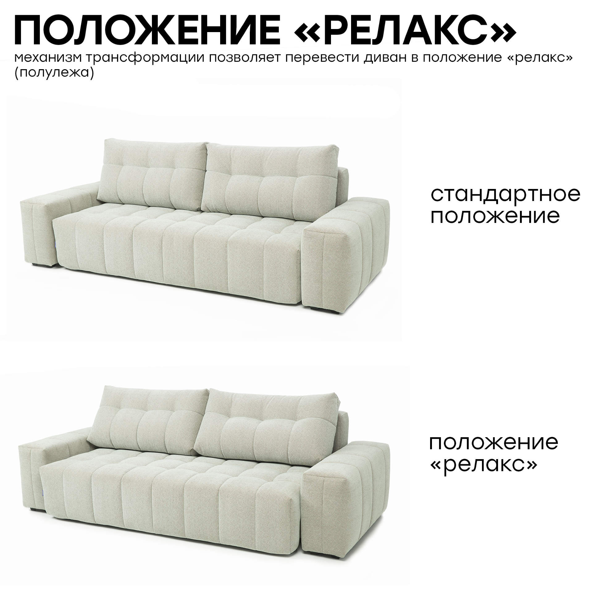 Модульная коллекция «Брайтон» — это сочетание технологий и минимализма. Особенностью коллекции является положение RELAX, которое увеличивает глубину сиденья на 30%. Подушки изготовлены из кокосовой койры — одного из самых экологичных и долговечных материалов. Благодаря своей специальной форме, они идеально подстраиваются под изгибы тела, усиливая эффект от положения RELAX.