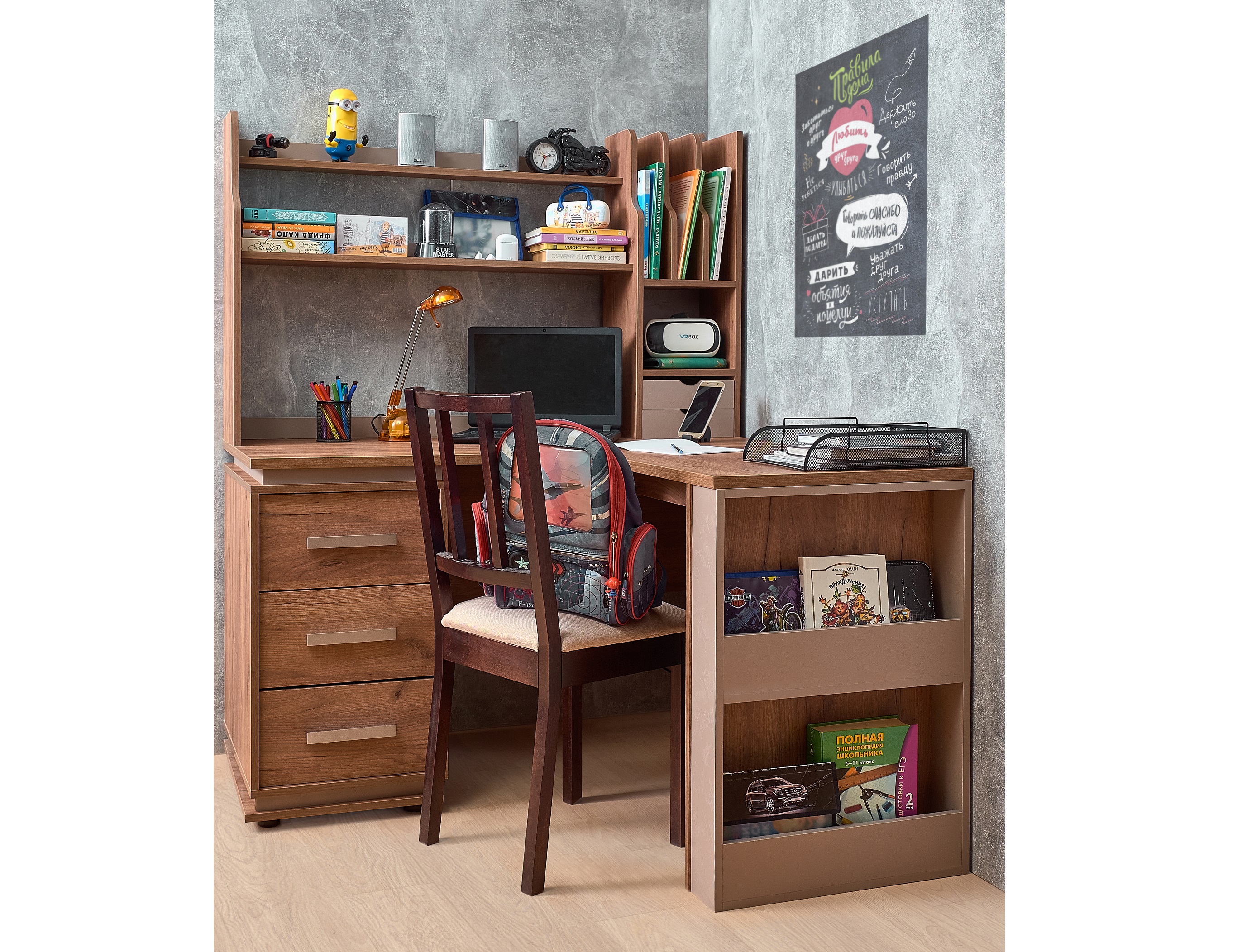 Рабочее место подростка должно быть правильно оборудовано. Домашние задания легче и удобнее будет выполнять за вместительным письменным столом. В размещении и хранении всего необходимого для учебы ребенку помогут дополнительные модули коллекции Nature: шкаф-надстройка, стеллаж-надстройка, стол приставной угловой.