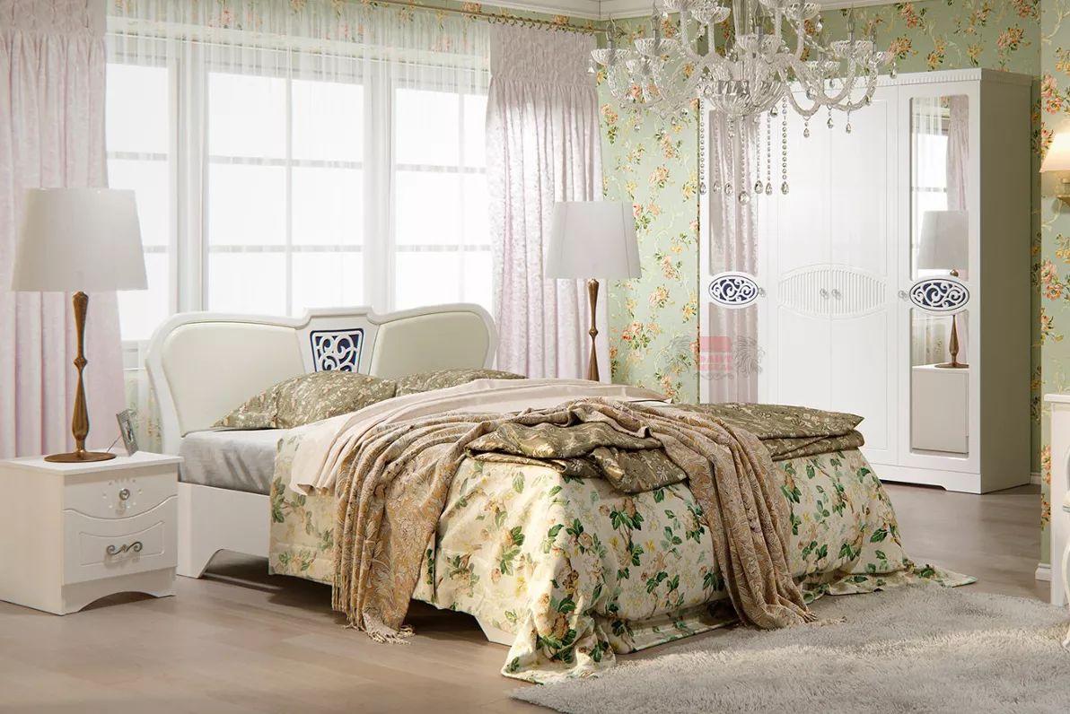 Спальный гарнитур в классическом стиле с фигурными фасадами из МДФ. Кровать оснащена ортопедическим основанием. Матрас в комплект не входит и приобретается отдельно.